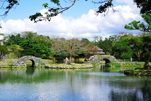 1799年、15代尚温王のとき造営された。日本風(築山心字池)、中国風(石橋、六角堂)を取り入れた琉球独自の回遊式庭園。王家の保養や冊封使の接待に使われました。